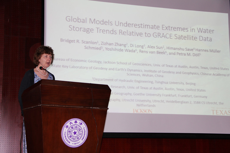 美国德州大学奥斯汀分校的Bridget Scanlon教授首先高度评价了GRACE重力卫星在区域地下水储量变化和极端气候事件影响评估中的重要作用,并详细展示了她近期联合多位同领域专家对GRACE卫星监测的176个国际大型流域多年蓄变量变化趋势以及季节波动与多种全球水文模型、陆面模型的对比分析结果。同时,Scanlon教授还对新一代GRACE-FO重力卫星的性能做了介绍,并对陆面水文模型下一阶段的发展方向进行了总结和建议。