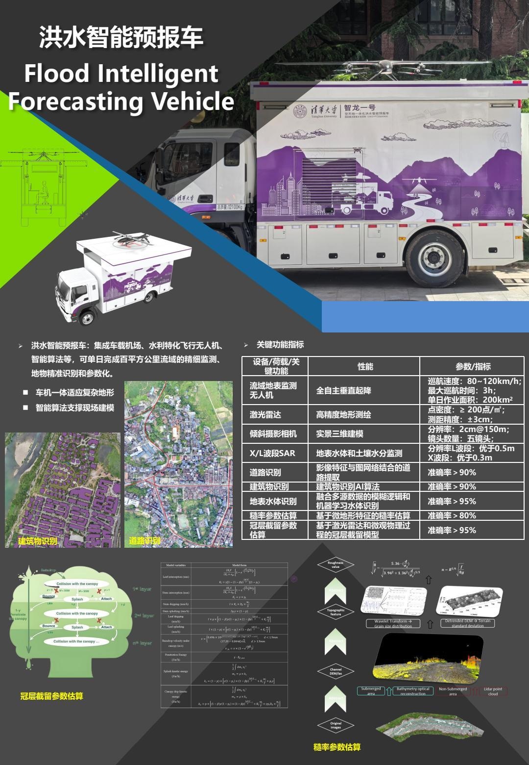 智能洪水预报车辆是一套移动式空地一体洪水建模参数勘测装备。该装备将完整的遥感实验室集成在一辆卡车及无人机组合中:车载“机场”可供 eVTOL无人机自主起降,搭载 LiDAR、X/L波段合成孔径雷达和倾斜摄影相机,适用于山区复杂地形。能以亚米级精度单日测绘 200 km2,嵌入式AI 实现道路、建筑物与水体的准确识别,一级地表糙率与冠层截留等参数的提取,并即时接入洪水预报模型,可在现场提供近实时态势感知和可靠的洪灾风险预测,为应急响应提供决策支持。